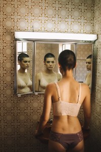 Is beautiful standing in front of the mirror,